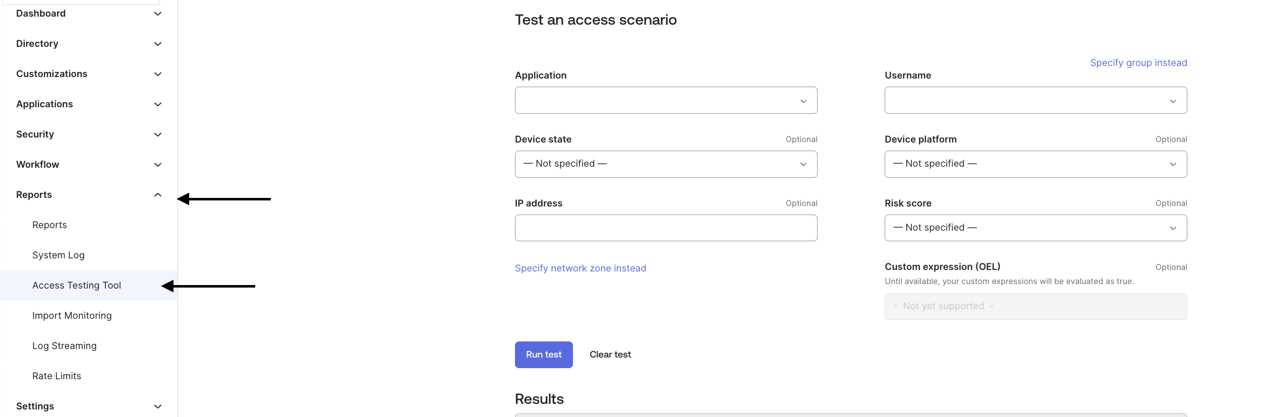 - The Access Testing Tool can be used to verify whether the policy is working as expected on the Okta Identity Engine. For more information about this feature, please refer to the link in the related references below.