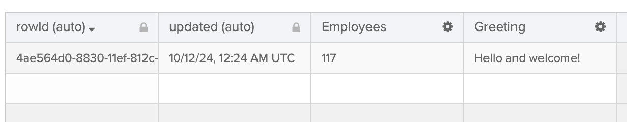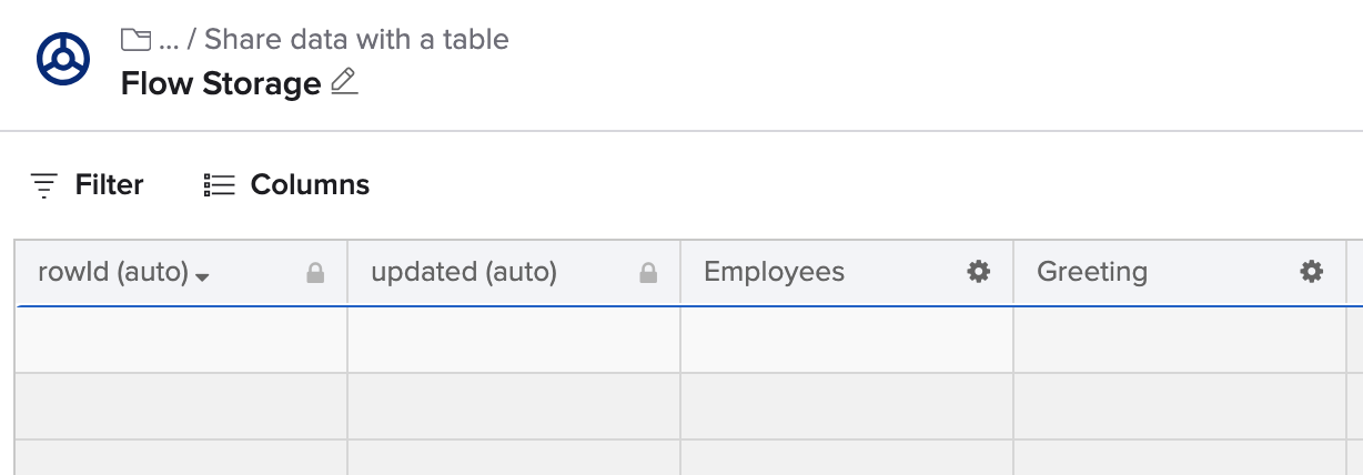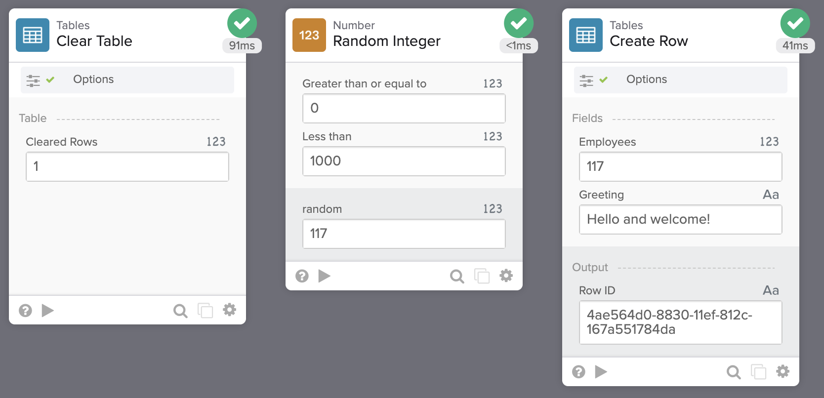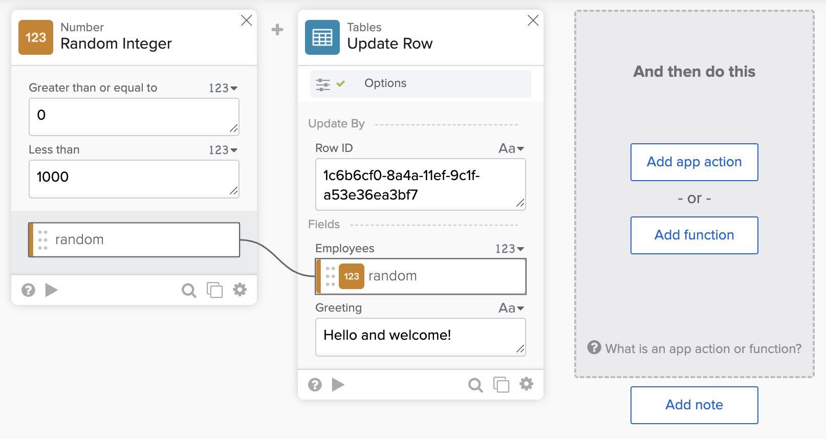 The flow above saves a random number between 0 and 1000 for Employees and a text message for Greeting into a table.