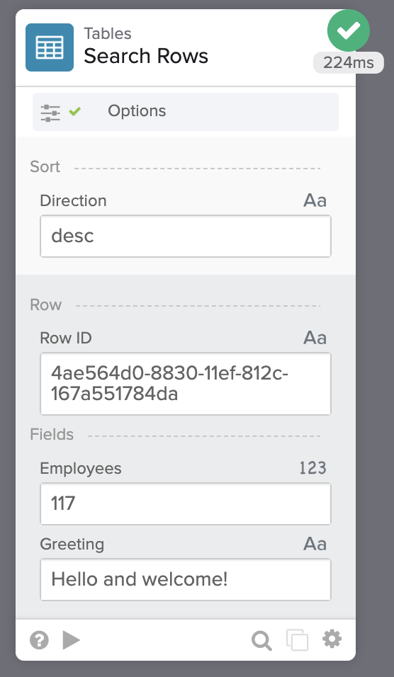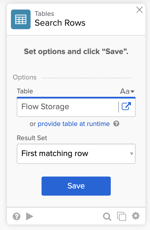 Manually create a table row with empty columns. Use its row ID to save data (Table – Update Row card) and read data (Table – Read Row card) from a table.
