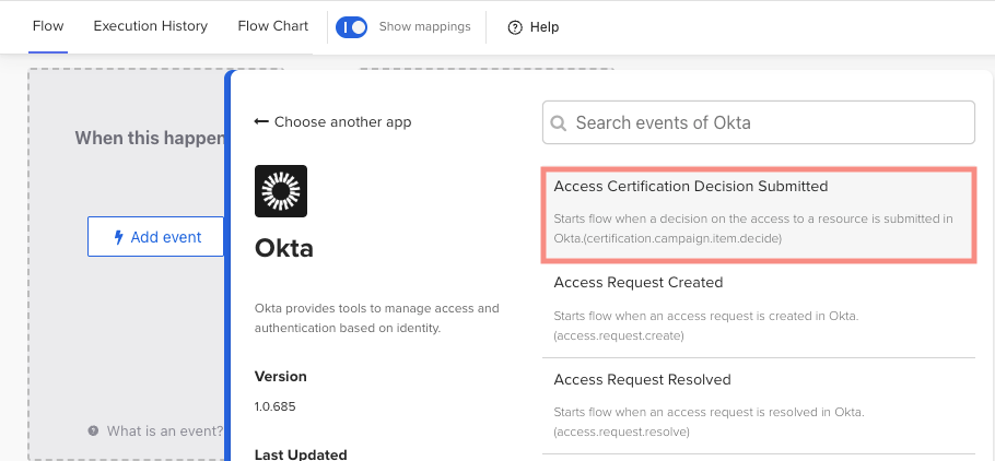 After understanding how this solution will work, let us dive into how to create the workflow needed for this functionality. The workflow needed for this solution has to be invoked using an Okta Event, which is Access Certification Decision Submitted.