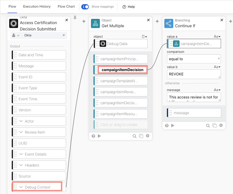 This event will fetch all the details related to this particular event from Okta and present them in the event output, but only Debug Data from the Debug Context section will be used for this flow. Debug Data contains crucial information about the campaign and its associated items, but only some of the data is to be used. In order to extract the required data, a Get Multiple Object card will be used. Using this, we can fetch and use each of the data points separately.