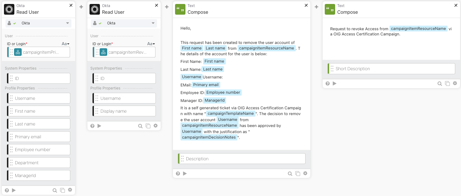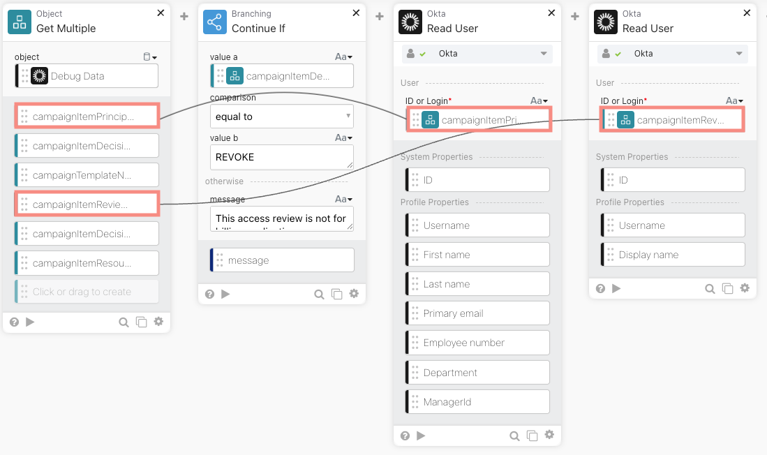 Now, once we have filtered out the Revoke-based Access Certification event, we will fetch the details of the User for whom the access certification decision was submitted as well as the details of the reviewer. This can be achieved using the Okta Read User card. The campaignItemPrincipalId and campaignItemReviewerId will be used as input to each of these cards to fetch the details of the User and the Reviewer.