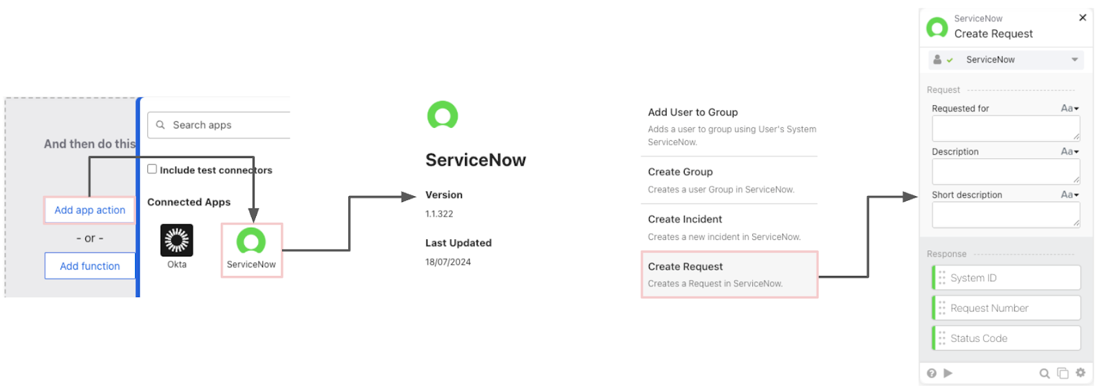 When the Description and Short Description are ready, we will use the App Action button and select the ServiceNow app, which in turn will present all the actions available with it. From the options, we will select the Create Request action. Select the options Requested for, Description, and Short Description from the list of available options and Save.