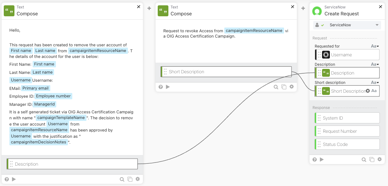 The output from the Read User card will be used to articulate the message to be fed into the ServiceNow ticket. A Compose card will be used to create the Description, using the User’s attributes such as First Name, Last Name, campaignItemResourceName, Username, Email and ManagerId. Also, we will be using one more Compose card to formulate a Short Description which will be used for the title of the ServiceNow ticket.