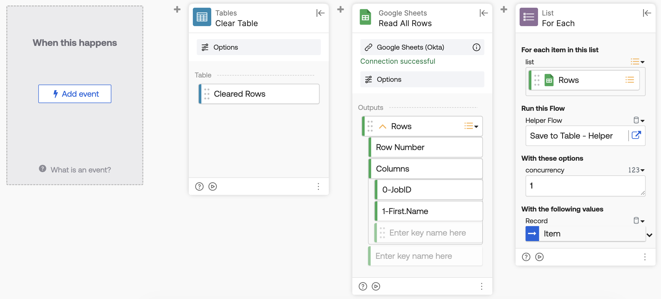 This article will teach you how to export Google Sheets data to a table using Okta Workflows.