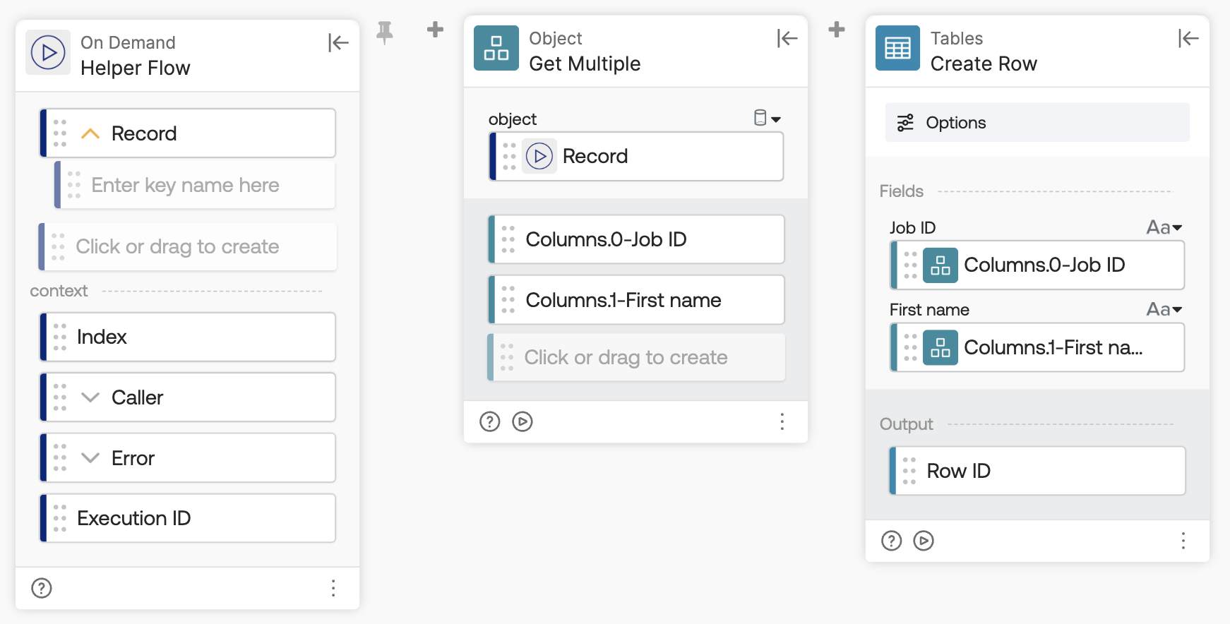 - The Object-Get Multiple function card extracts Job ID and First name from the Record JSON object.