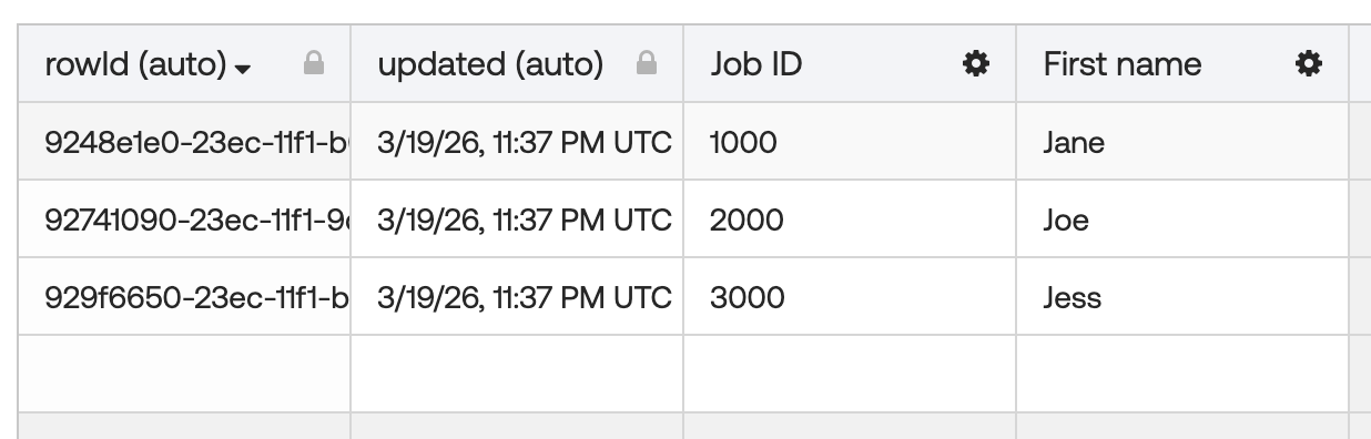 - The Tables-Create Row function card saves the Job ID and First Name into a table as a new row.