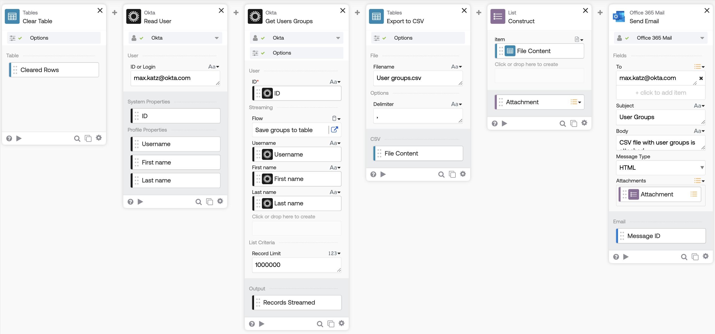 - List user groups: flow lists user groups, exports them into a CSV file, and emails the file.