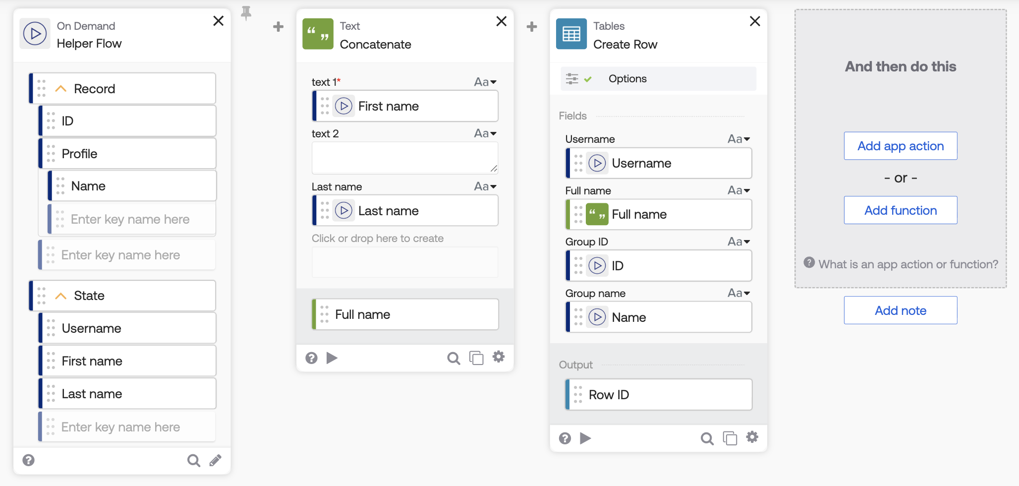 - The Record object holds each group object passed from the main flow. In addition, the Record extracts two properties from the group JSON object: ID and Profile.Name instead of using the Object-Get or Object-Get Multiple card.