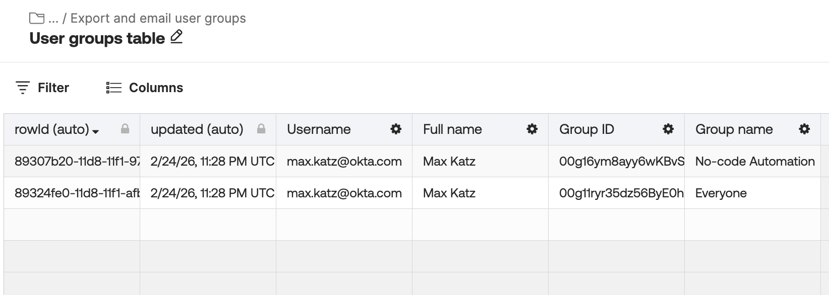 - Save groups to table: flow saves user groups to a table for exporting to a CSV file.