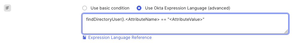 Ifcondition, select Use Okta Expression Language (advanced). - Enter the expression in the following format, replacing