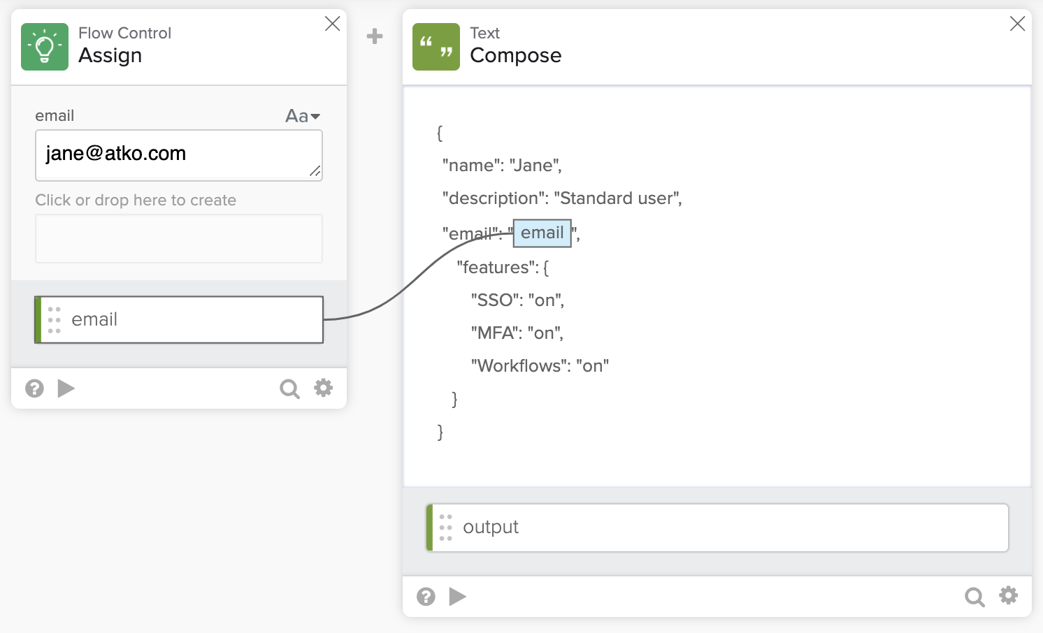 A nested JSON object can also be created with the Object-Construct card. Notice that the field name is set to user.email, and uses a dot notation: