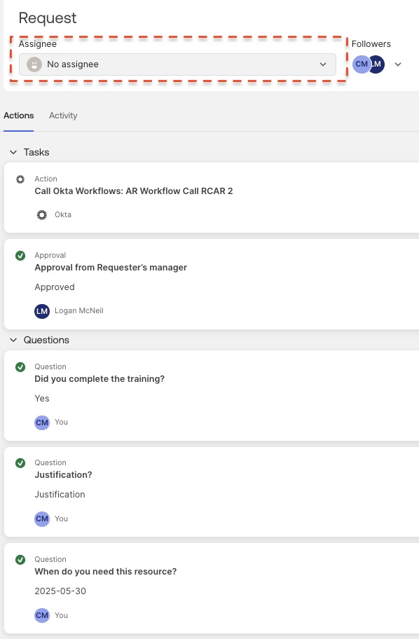 An Okta Workflow might fail to execute when called from Resource Centric Access Requests (RCAR V2) due to the absence of an "Assignee" variable. RCAR V2 requests do not automatically have an assignee, causing the workflow to halt. To resolve this, avoid using the Request Assignee Email Address by default when call the workflows or manually specify an Assignee within the Access Request Console.